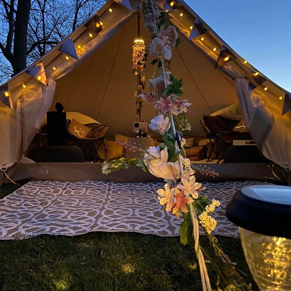We arrive at your home or venue to set-up either a 210 square foot or 415 square foot all-weather canvas bell tent and lavish your tent with all the luxurious amenities for your GLAMPING OASIS or LOUNGE including Lighting, Decor, And More! All you have to do is start the campfire, get COZI, and enjoy the MOON and stars!